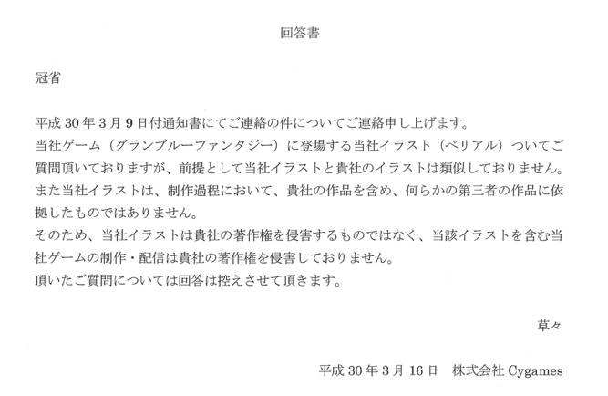 そこで、 弊社の対応として、 Cygamesに対し、当方イラストの著作権を侵害していると思われる旨を通知し、ベリアルのイラストを採用することになった経緯等について回答するよう、Cygamesに求めました。